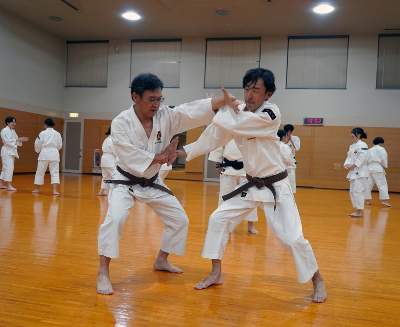基本の修練では主に「突き」「蹴り」「受け」の修練を行うほか、倒れたときに身を護るための「受身」の修練も行います。